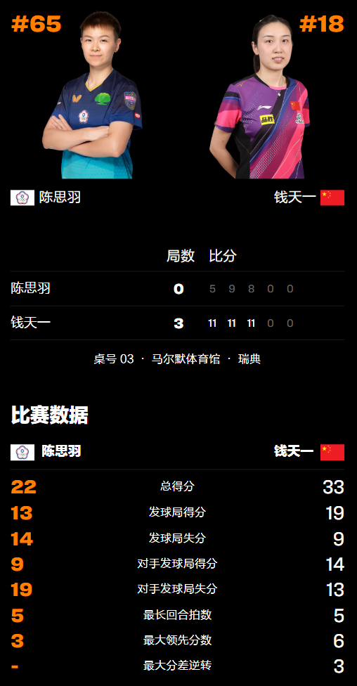 北京时间8月17日晚,乒乓球WTT欧洲大满贯瑞典站迎来正赛首日较量,国乒选手钱天一登场,与中国台北运动员陈思羽对决,结果钱天一发挥稳定3-0淘汰对手入围女单32强,同时也为本队赢得了本站比赛的第一场胜利,详细战况请看下文。